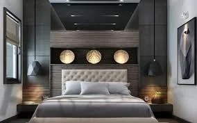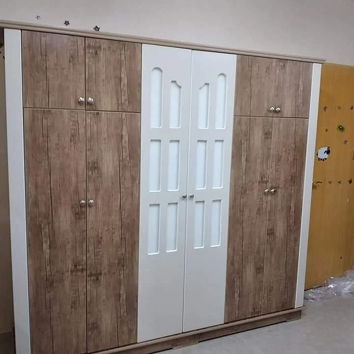 - خلفية السرير يوجد بها حفر بسيط موجود في خلفية السرير يتميز دولاب الغرفة بالبساطة فهو عبارة عن دولاب أبواب الدولاب على شكل جرار لكي توفر مساحة.